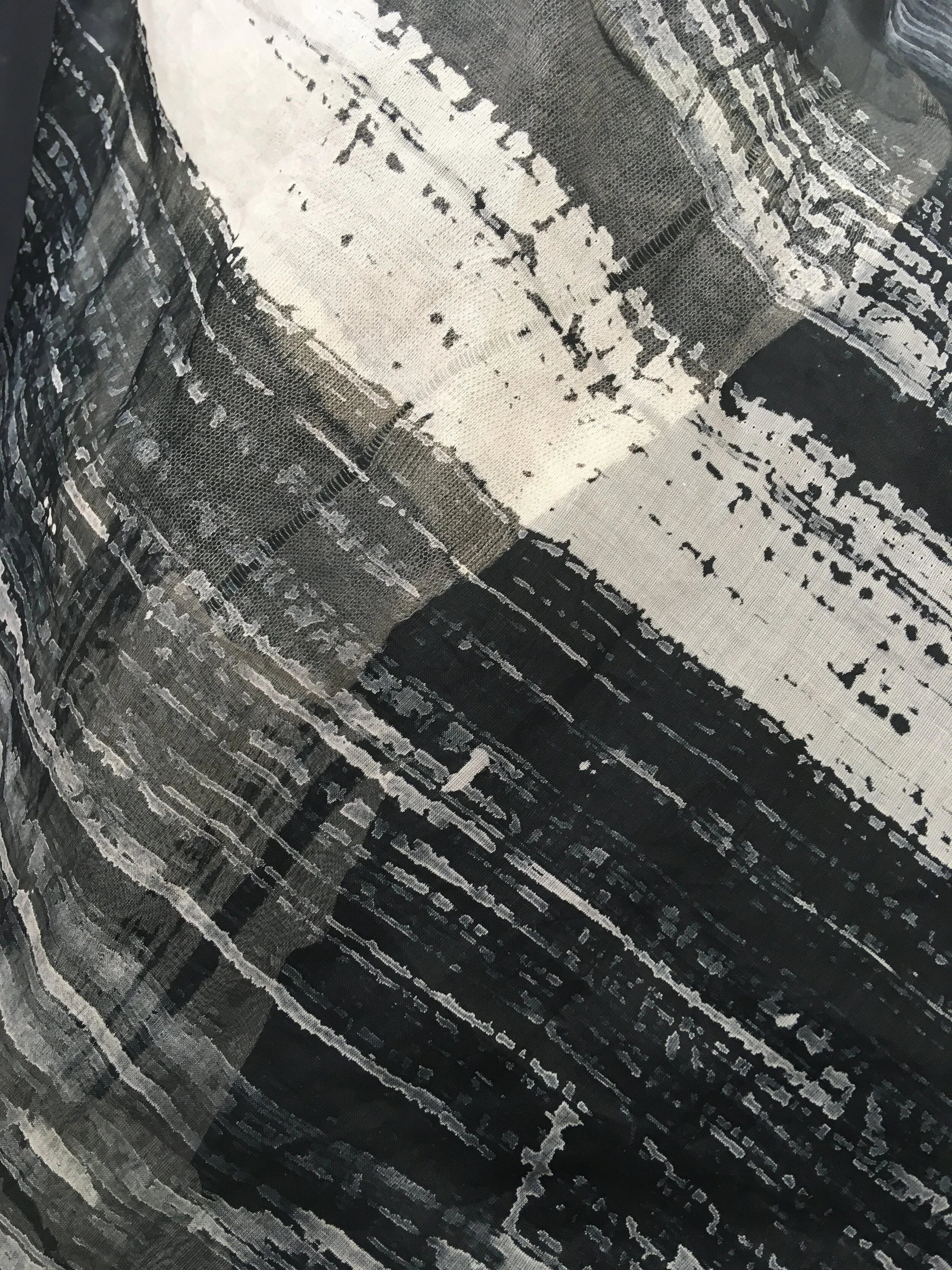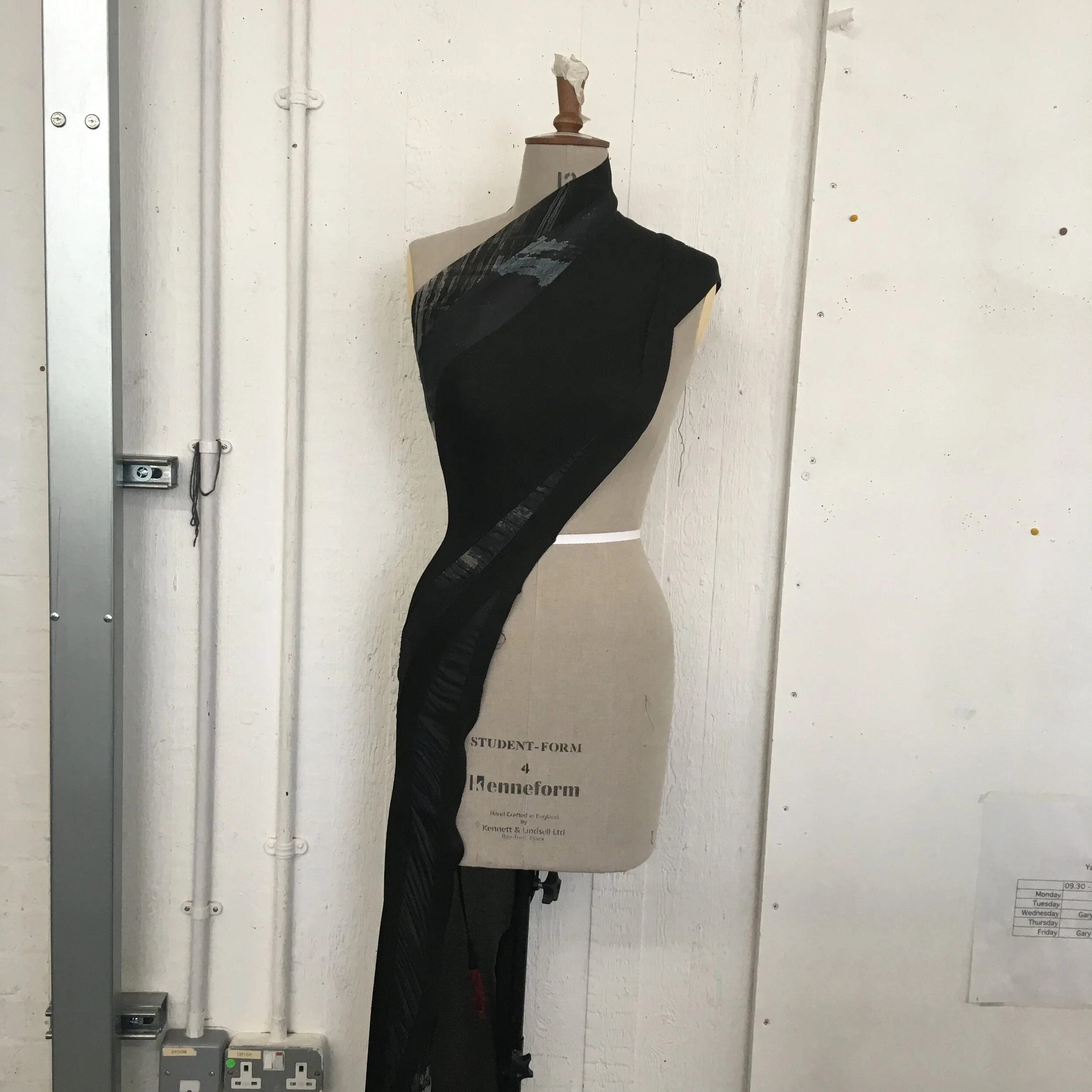 Using a selection of black woven and knitted fabrics, I created texture and colour through different colour bleaching processes.