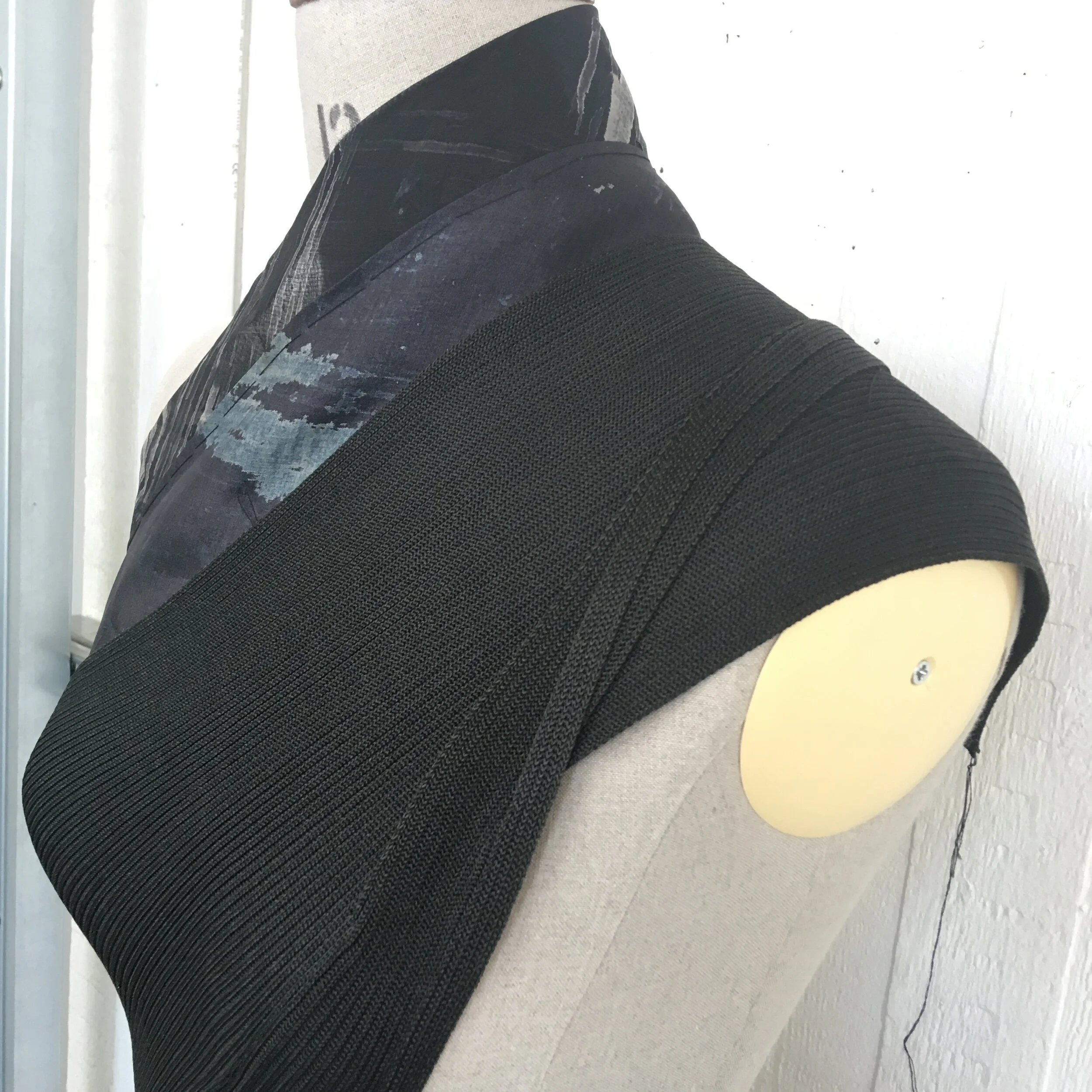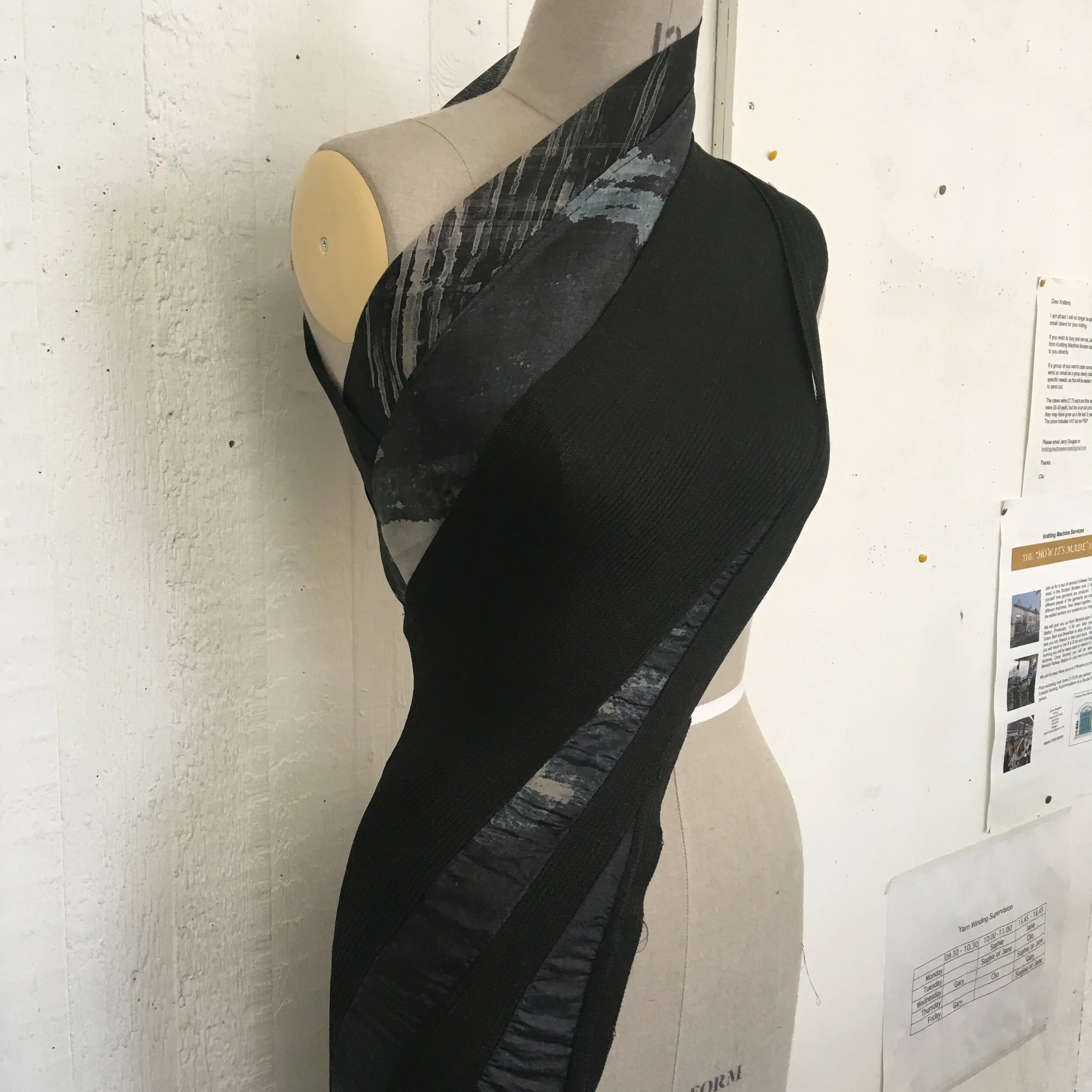 So I made an evening dress. I have combined the woven fabrics with knitted panels. The integral properties of the knit mean it doesn’t need fastenings and will fit smoothly over the body. The woven fabrics add volume and help create a larger silhouette.